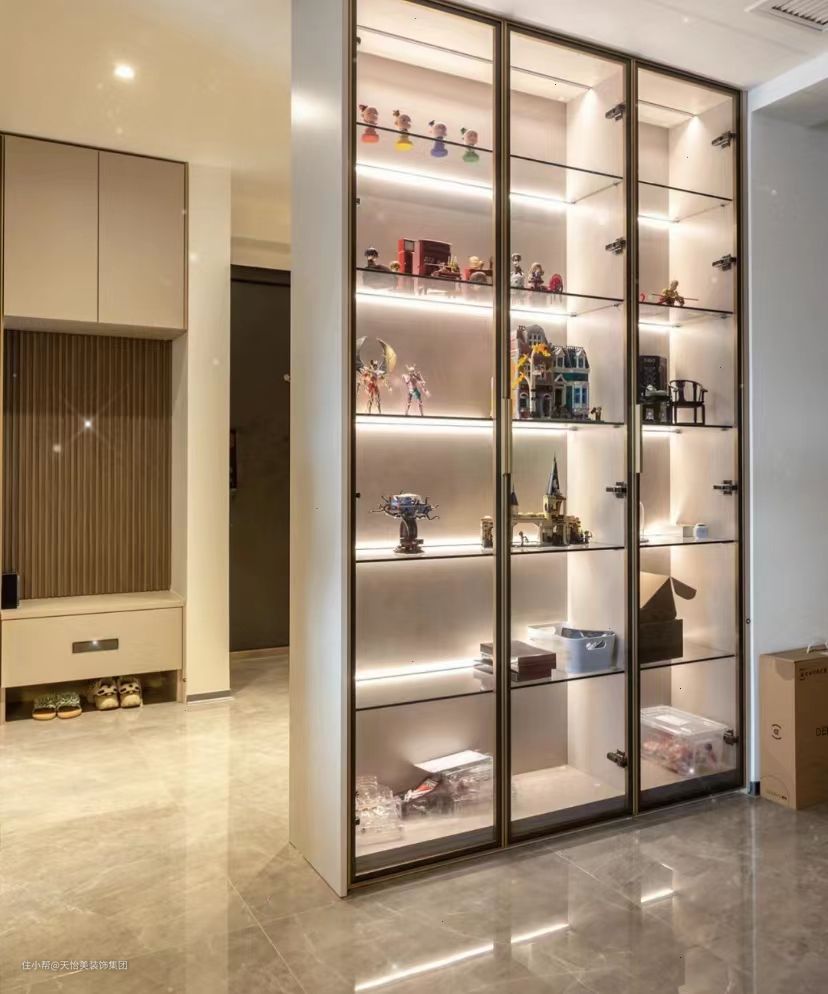 并且,玻璃柜门的颜色也可以随之改变。比如,茶色or灰色的透明柜门搭配上各种潮玩手办,更能体现一种家居的高级感,更符合现代年轻人的审美。
