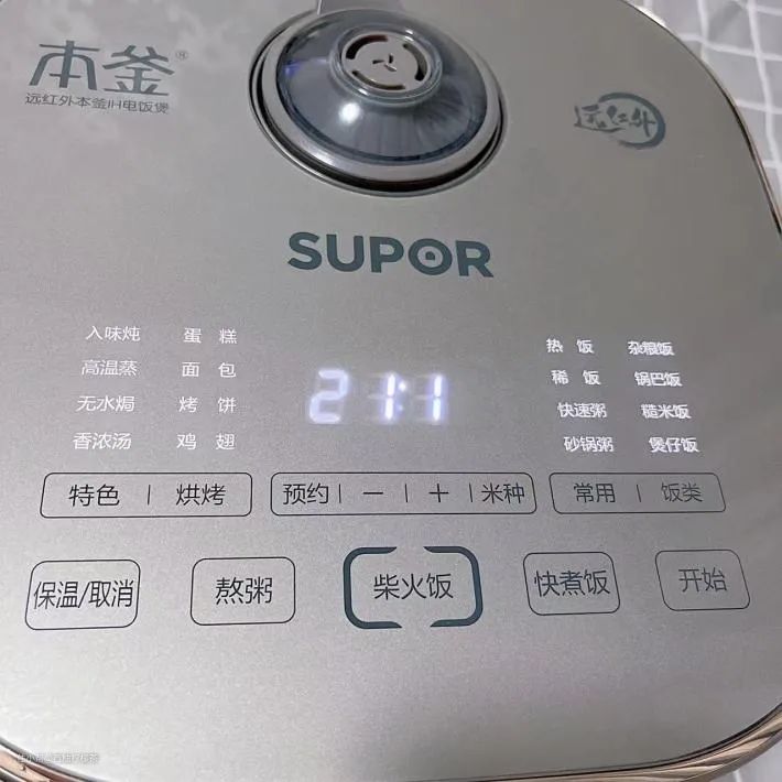 苏泊尔远红外电饭煲的按键一共有13个,主要的开始、保温/取消、熬粥、煮饭、柴火饭都是快捷键操作,一键直达设计;更多特色功能需要通过上面的一排按钮进行选择,这种操作方式应该更受年轻人的喜爱。