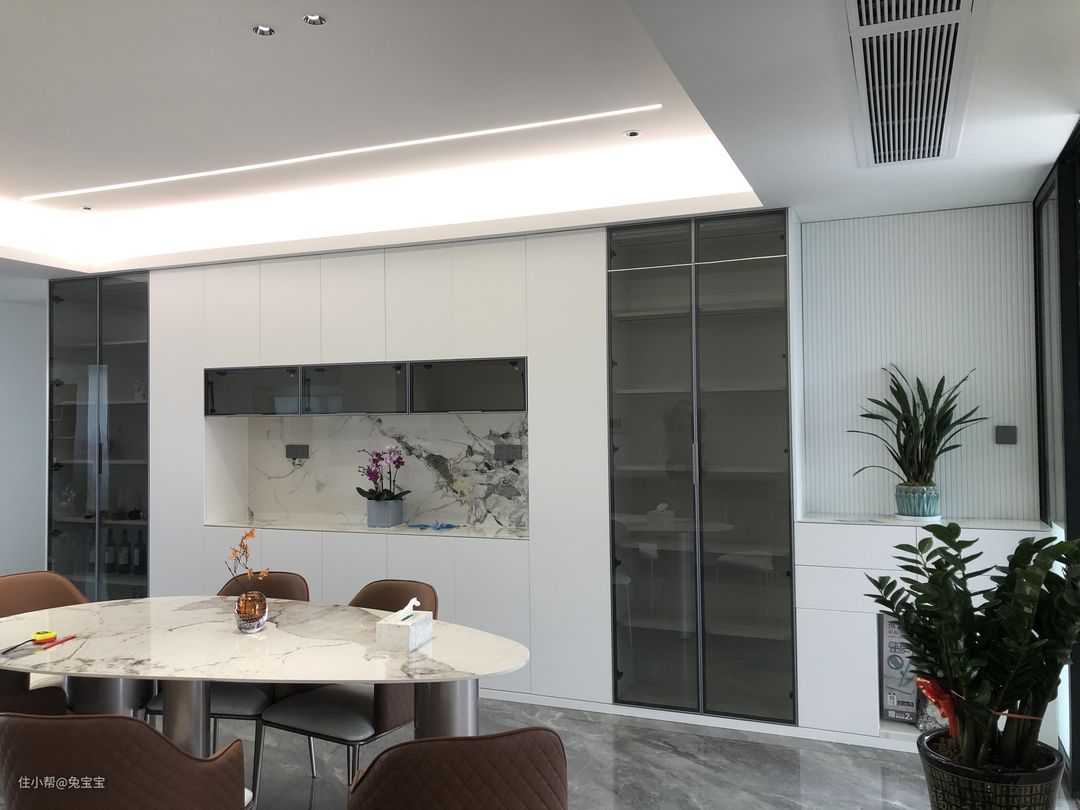 开放式厨房搭配窄框玻璃柜门,绝对是加分项。