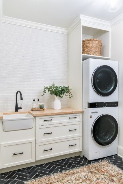 8. 智能空间规划这个家中创造了一个勤奋的角落。堆叠式机器、紧凑型水槽和小型折叠台面增加了功能,而不会占用太多空间。人字形图案的黑色瓷砖地板与其他黑色细节相协调,为白色和奶油色元素带来一丝时尚的对比。