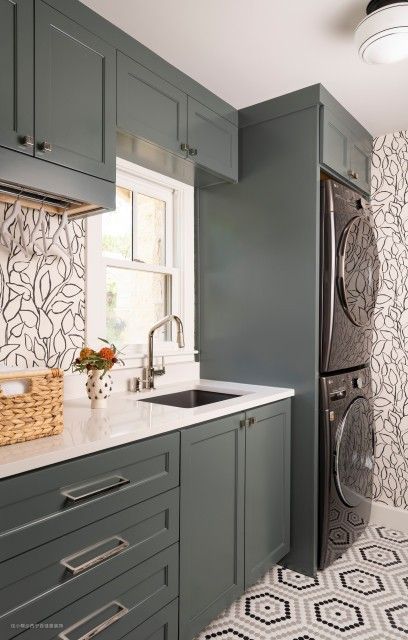 3. 个性风格我们的设计师提升了这个洗衣房的外观,配有喜怒无常的灰色橱柜、绿叶剪影壁纸、六角形马赛克地砖和校舍天花板灯。隐藏在上层橱柜下方的干燥棒可以拉出,在节省空间的同时增加功能。堆叠式电器是另一个节省空间的功能。