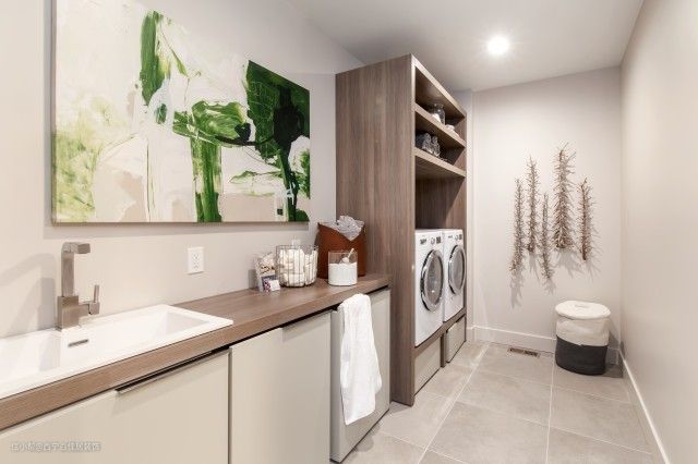 5. 现代清理RM室内设计为辛辛那提洗衣房增加了灰色染色木橱柜和台面空间。一个平台将机器抬离地板,使房主更容易进入。平板橱柜和 60x60厘米瓷砖地板与木质色调搭配,营造出干净的现代风格。超大实面洗衣槽配有集成式搓衣板,可擦洗污渍。