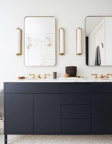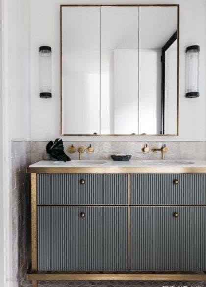 很简单柜子设计,柜面全部做了隐形拉手,很现代的设计,在与镜面或水龙头搭配时,又选择金色,很质感奢华,年轻精致生活必备了。推荐材质选择双饰面板。