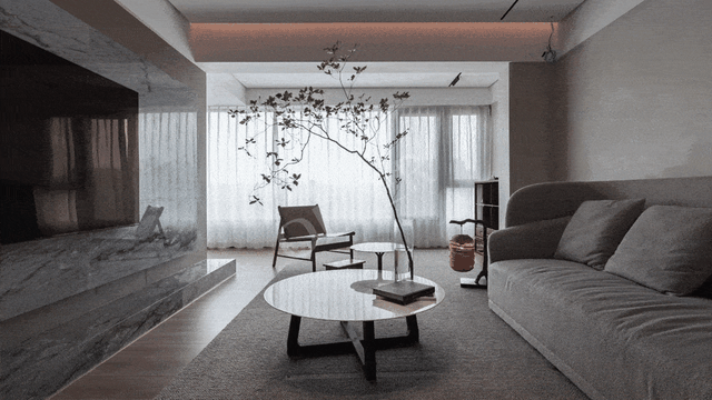 入户玄关延伸至电视机背景墙应用了大面积灰色系的天然理石,打造空间质感的同时,为整个家增添一种温润的“自然韵律”。