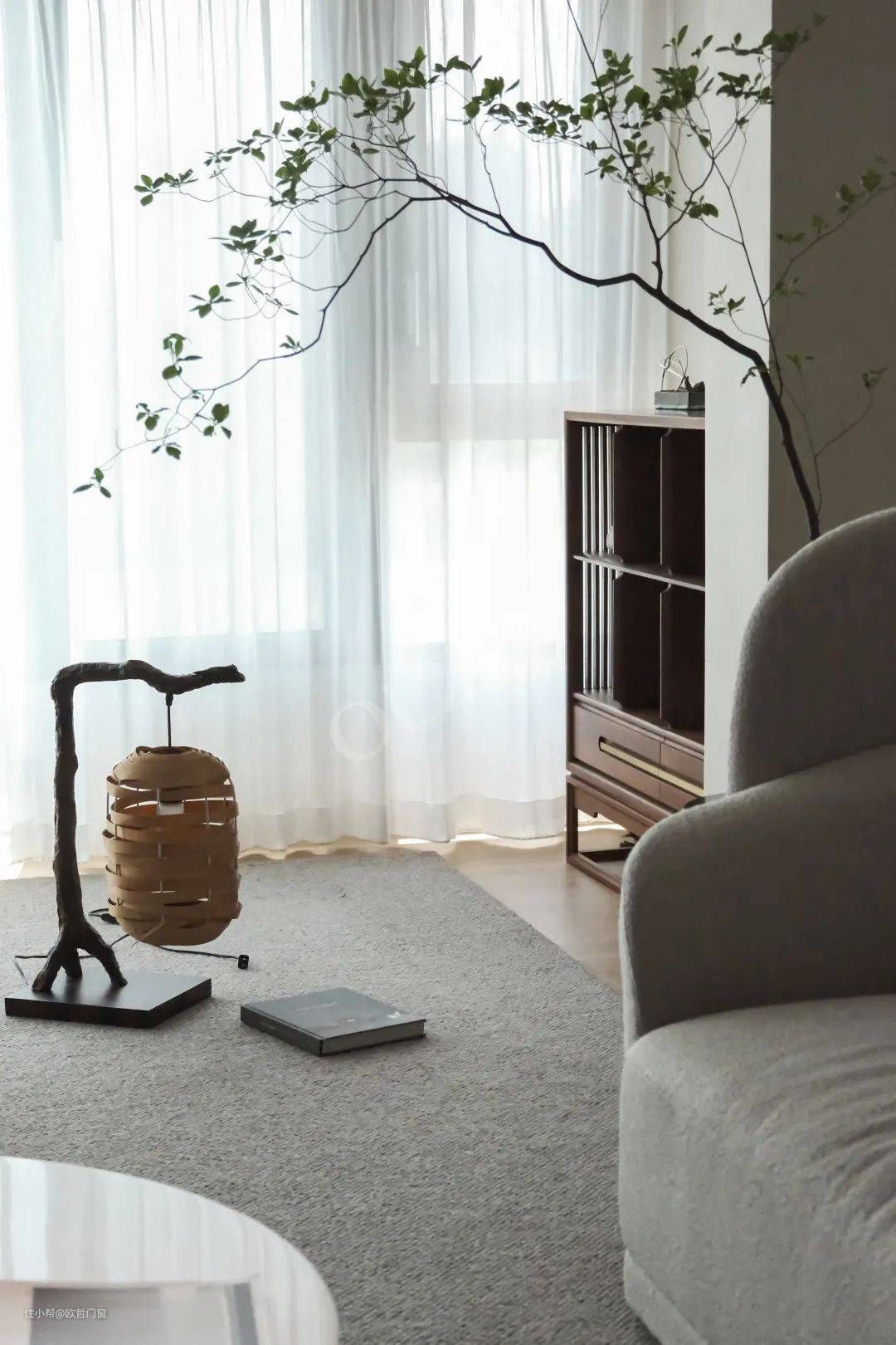转至南面,一个5m长的玻璃落地窗成为整个客厅的视野和光线来源。一整块通透的玻璃固定窗,将室内视野延伸至窗外江景,实现无障碍赏景的居家幸福感;最大程度增加空间采光的同时,让光成为氛围的映衬,拉上窗纱,光与时间的细语正在发声,在这里完成一场与自然共鸣的对话。