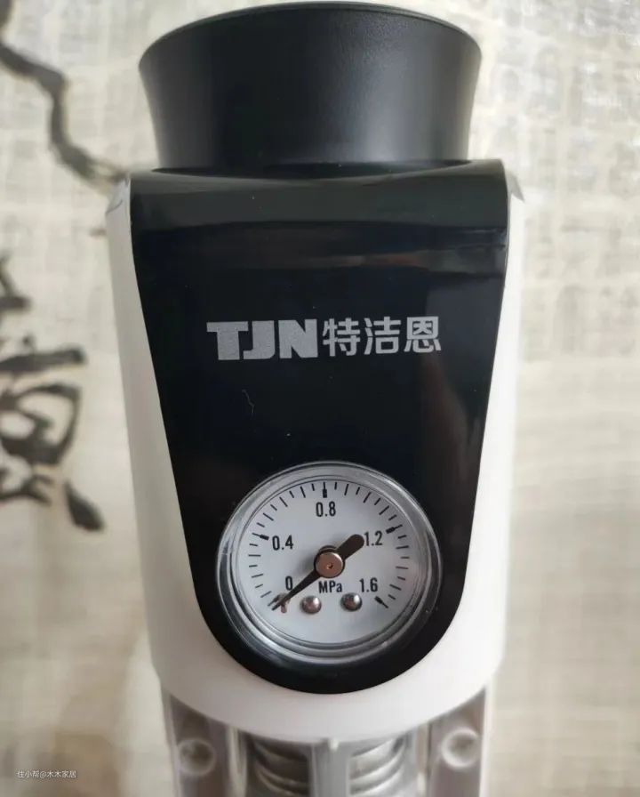 在它上方是个水压指示仪表,自带水压的稳压稳控功能,有效避免高压水压对于末端的伤害,只要把这个顶部黑色帽子往上拉一下,就可以左右旋转它,打到精细调整稳定水压的动能。