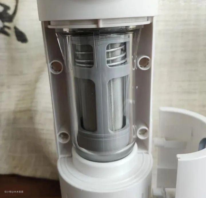 前置过滤器中间盖子掀开,里面是透明可视筒,内置316食品级不锈钢耐腐材质滤网,透滤精度为40微米,精准度堪称行业领先。