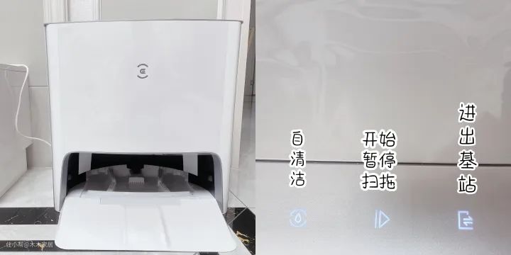 外观采用的是银白系列,整体看起来非常大气,摆在客厅角落里刚刚好,屏幕上方有三个亮光的图标,分别是自清洁、开始暂停、出回基站。