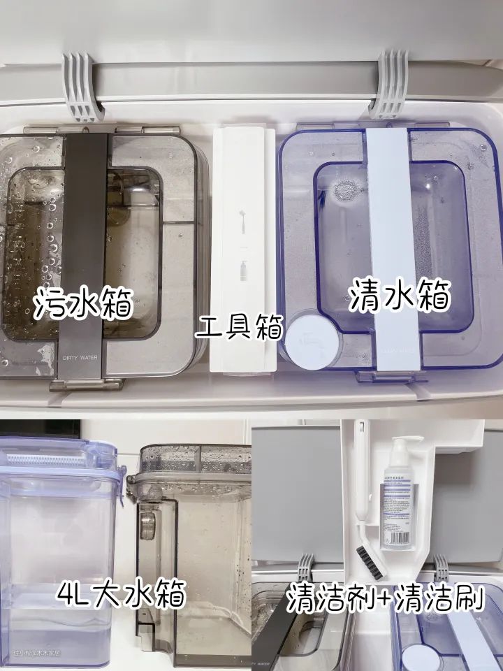 配件有两个4L容量的清水箱和污水箱,中间有个工具箱,里面是清洗剂和刷子,挺方便拿取得。在选配上,还能挑选银离子除菌模组和自动上下水模组。