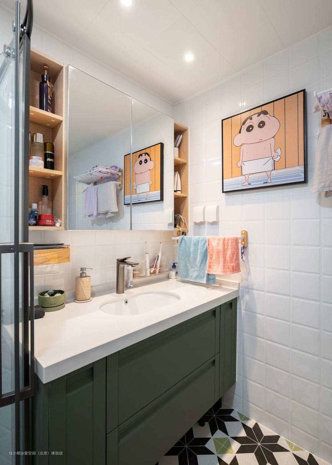 墨绿色浴室柜+铜质龙头、浴室柜设计开放格可放一些常用物品。镜柜空间做出开放格,放置常用洗漱用品,收纳合理划分,镜柜设计可以收纳更多储物空间,对小户型来说必不可少。