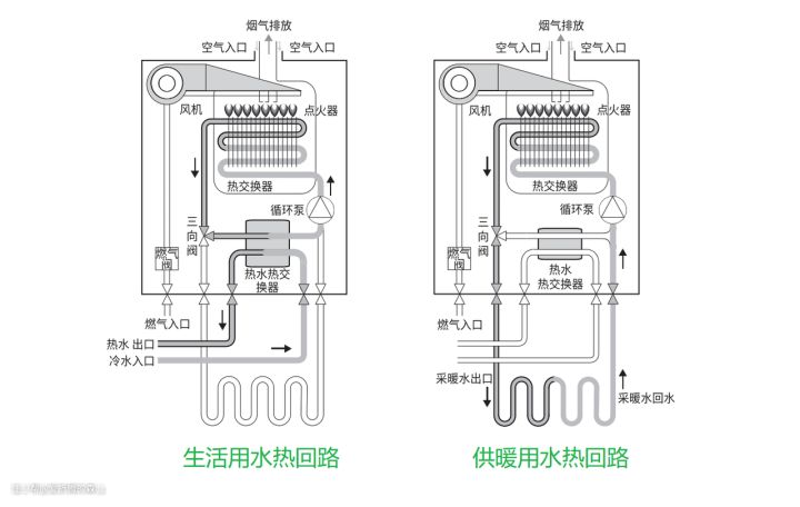 和热水器不同的地方在于,壁挂炉需要单独隔离出一路水路,用于支持供暖水路,所以在下图中可以看到在设备下方还有第二热交换器,这也是目前主流的板式换热器方案(下图是两种加热模式下的循环链路示意图)。
