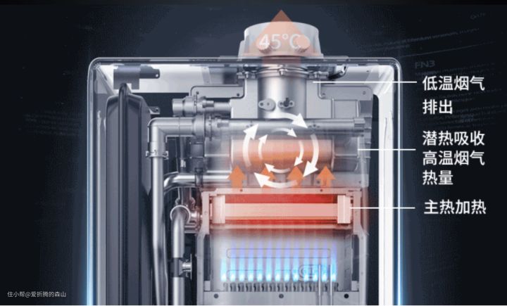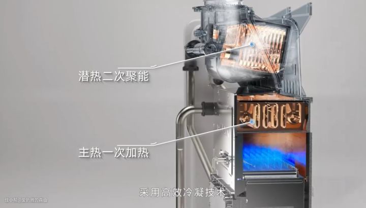 由于壁挂炉的热功率较大,通过交换器后,仍然排放出大量高温废气,这部分高温不仅对排气管路造成一定的危害,而且浪费了较多能耗,所以更高级的壁挂炉就出现了,它巧妙的利用冷凝原理,把多余热量施加到冷水进水路径,进行预加热,这种热交换方式也被称为潜热交换器,所以冷凝壁挂炉是一种双重加热、二次加热的技术方案。