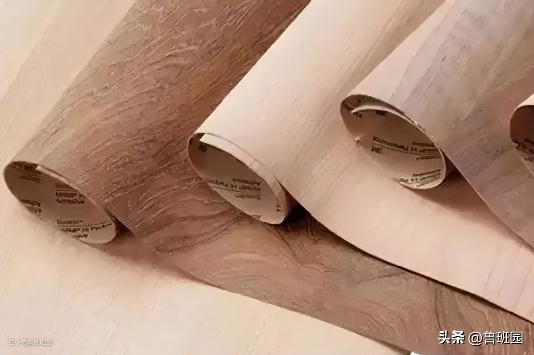 目前市面上主要有实木木皮、科技木皮、染色木皮等木质贴面家具,如下图所示是某UV薄木饰面板产品。