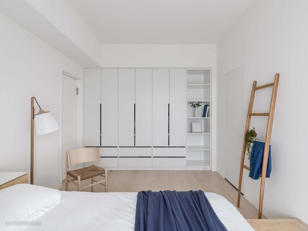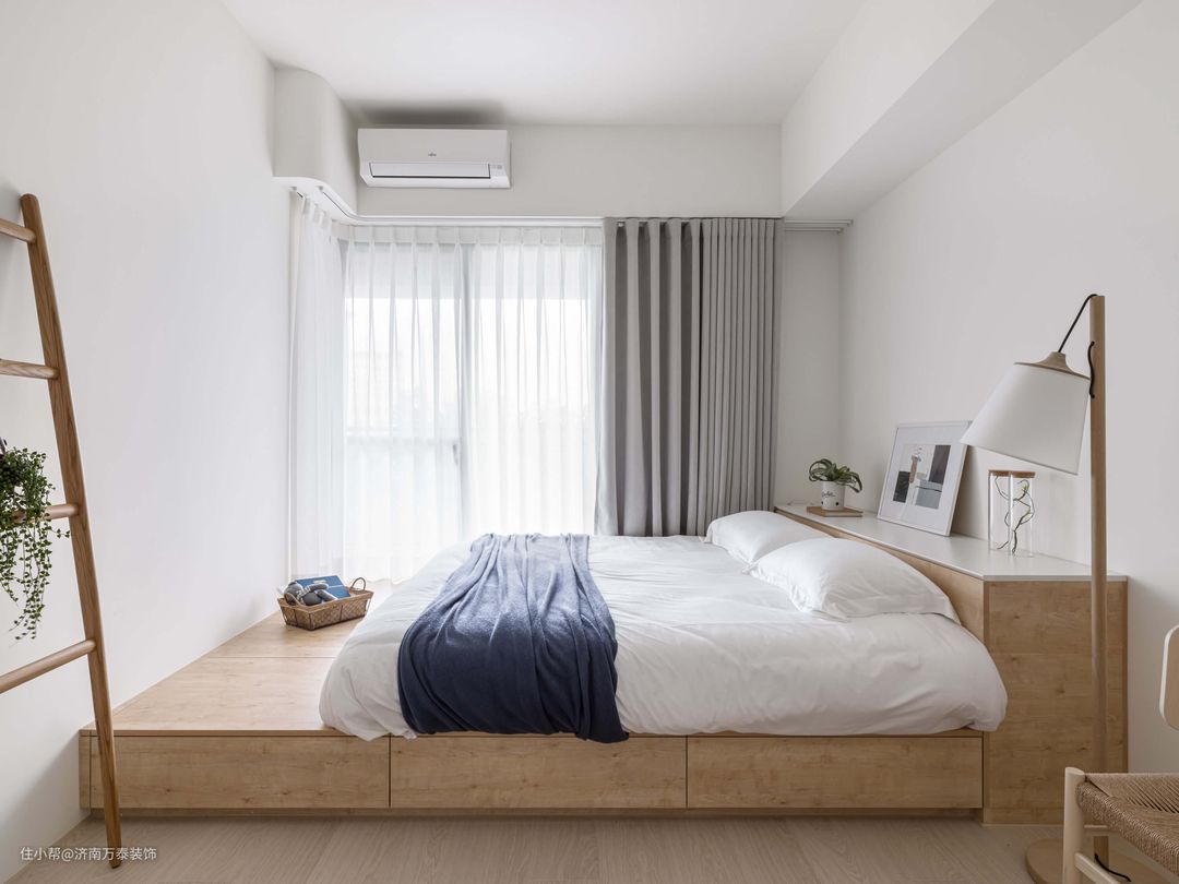 卧室做暖色背景墙面,放弃主灯,做无主灯设计,多做氛围灯或隐藏式灯带,避免夜间开灯刺眼,考虑地台床那可做一体式到顶衣柜,避免积灰增加收纳,看起来还更加时尚美观。