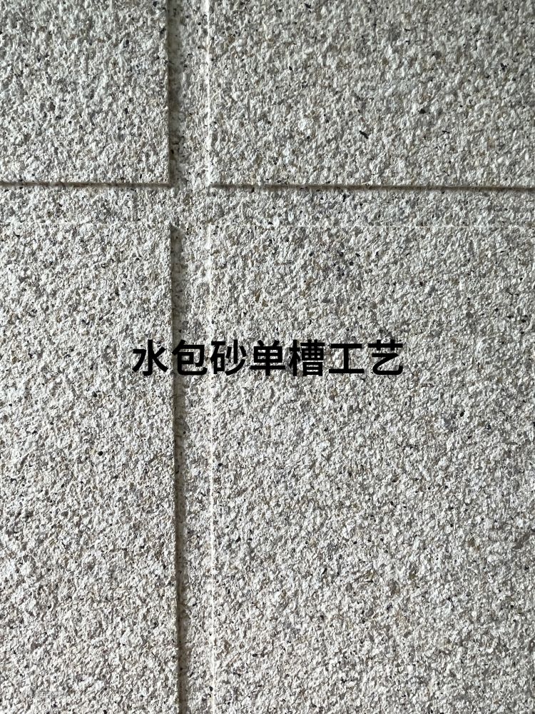 平缝工艺是在基层找平后,采用美纹纸进行分格,再进行水包砂施工喷涂。深槽工艺是在基层找平后,使用铝合金分格条进行分格,再进行凹槽塑形,最后再进行水包砂施工喷涂。