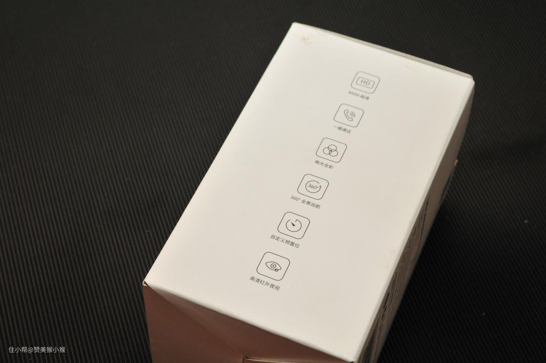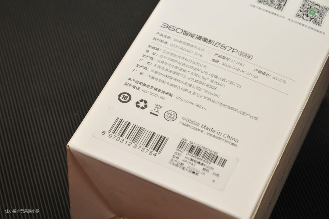 360这款家用摄像头的外包装延续了360一贯的设计风格,纯白色的包装点缀着一抹绿色。