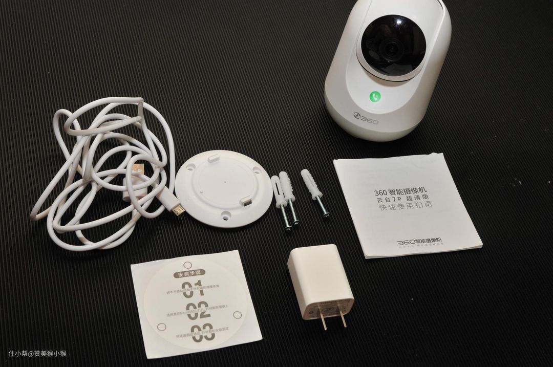 整个包装内包含了摄像头本体,电源线,充电插头以及三根膨胀螺栓以及安装底座和打孔定位贴纸和说明书几部分。其中电源线为TYPE-C插口,大大提高了线材的通用性。