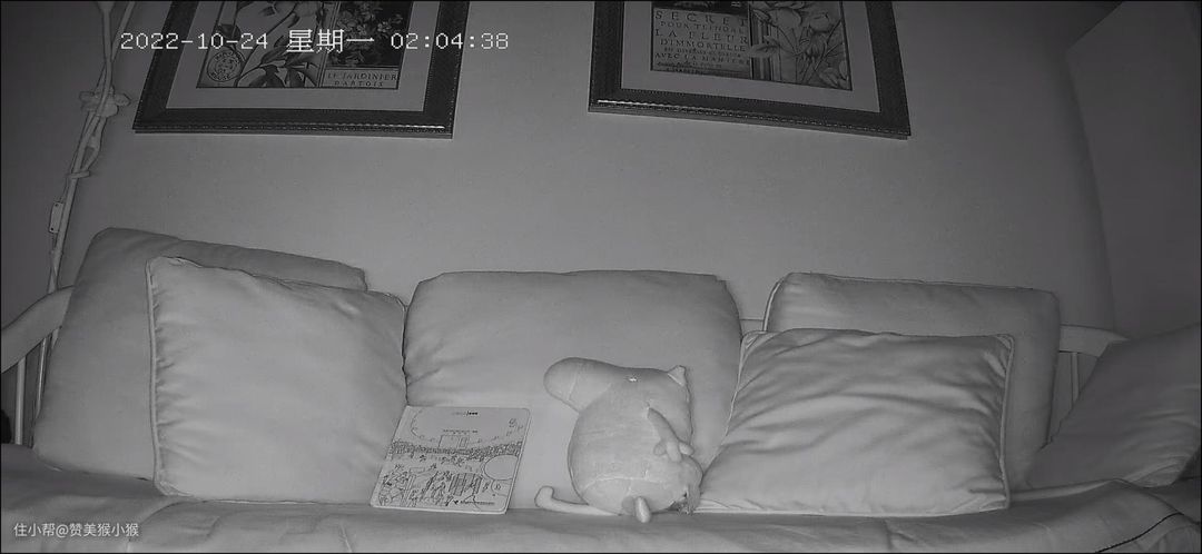 下面来看看三款家用摄像头在全黑环境下的画面表现如何。三款摄像头均开启夜间微光全彩夜视功能。由于三款家用摄像头均配备了红外补光灯,因此在夜间均以开启红外补光灯的形式进行不可见光照明,而画面中的照明光线皆来自各款摄像头自带的红外补光灯。