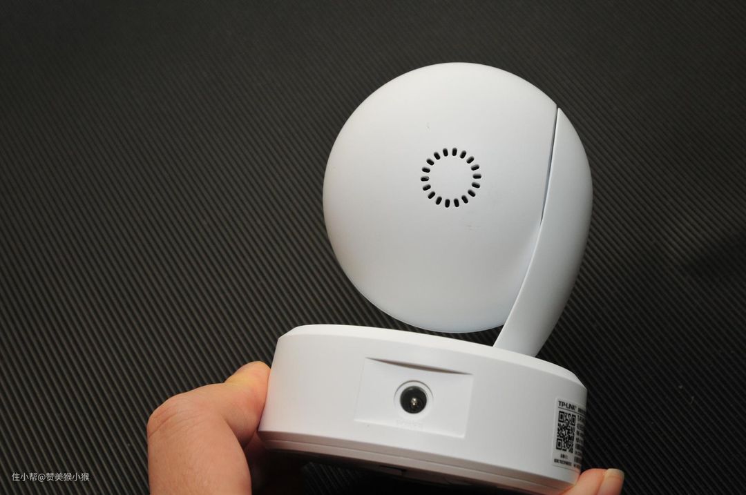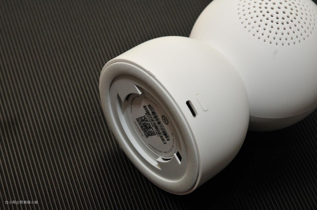 这款摄像头的电源插孔为TYPE-B接口,并且设置在底部内圈的侧面,这样插上之后不会影响云台的稳定性,同时内圈也带有过线槽。侧面同样带有一颗重置复位实体按键,用于配网时重置联网。