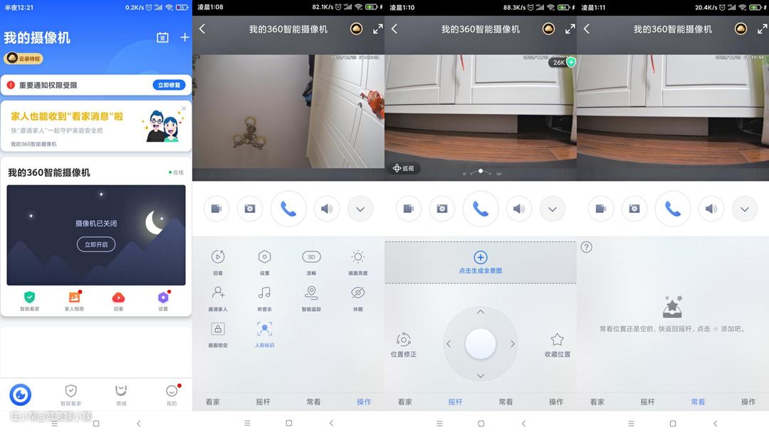 摇杆栏目的全景相机功能可以对家中摄像头摆放位置所监控到的全景进行扫描,然后通过设置常用监控点,在常看栏目中直接选点监控,省去了每次都要手动控制摄像头到点位观看的麻烦,这个功能很好用。