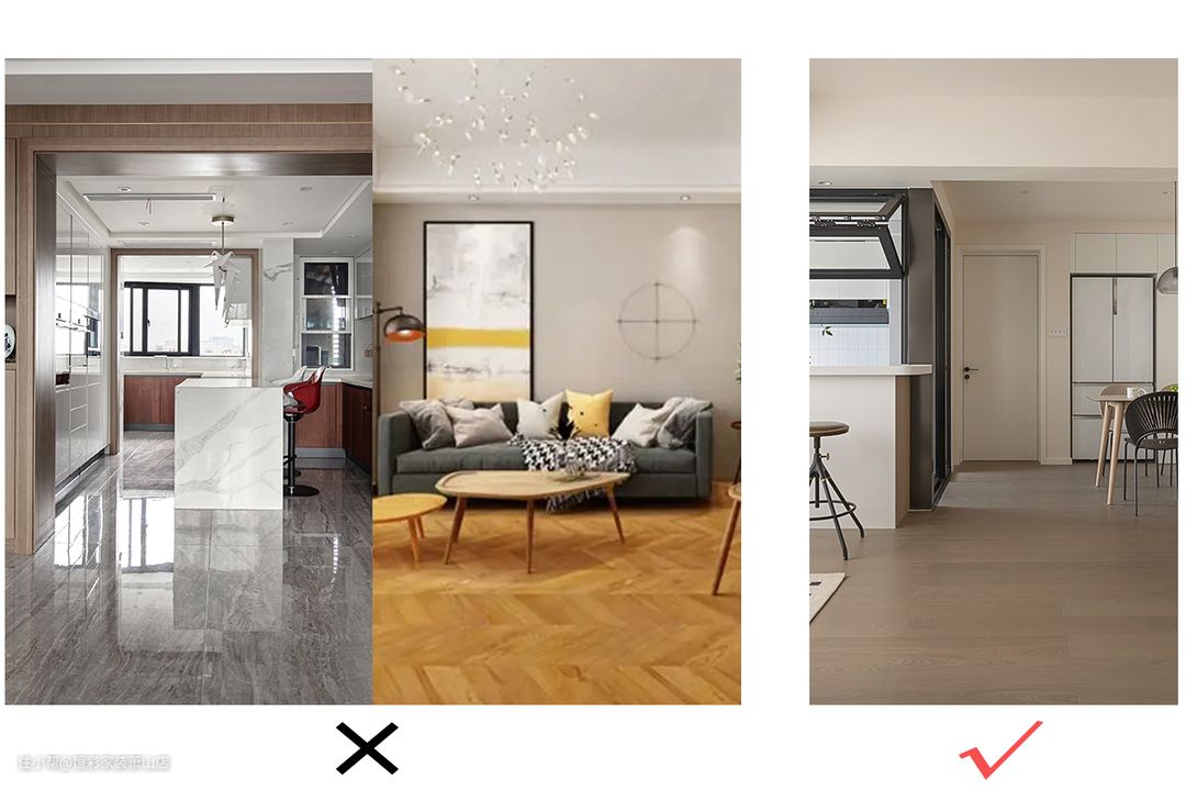 这里所说的地面材料不是高饱和的木地板或者是高亮的地砖,而是与背景墙相配合的低饱和板材/哑光砖。