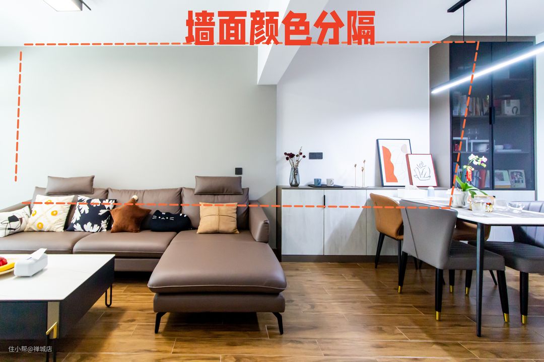 在客厅与餐厅区域的墙面上,做不同颜色或材质的区域,可以利用相近色系,做颜色区分,同时丰富了空间层次感。
