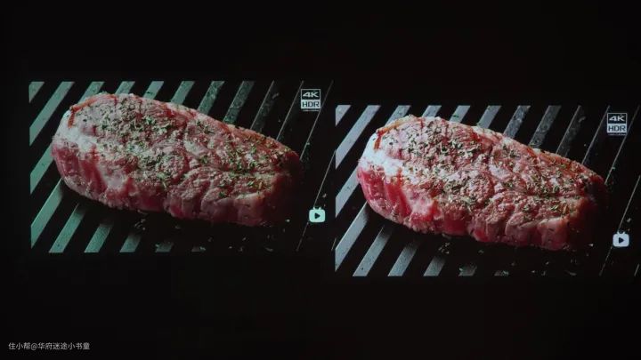 下面这张牛排的图片,左侧是极米H3S的,色调偏暗,颜色的饱和度不高,缺少食物本身的原色彩;而右侧是大眼橙X11的效果图,明显整体的色调更明亮一些,色彩基调还原了食物的本身,饱和度和对比度都很足。
