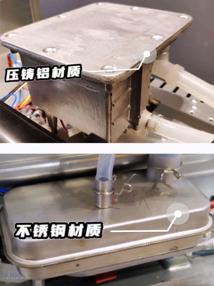 市面上常见的是不锈钢材质和压铸铝材质,最好选择不锈钢材质,在高温蒸发的过程中确保用水安全,避免使用自来水以减少水垢产生;压铸铝材质容易掉色,使用时间长了以后容易发绿变质,水箱中的水流进蒸发器蒸发后再与食物接触,不卫生也不健康。