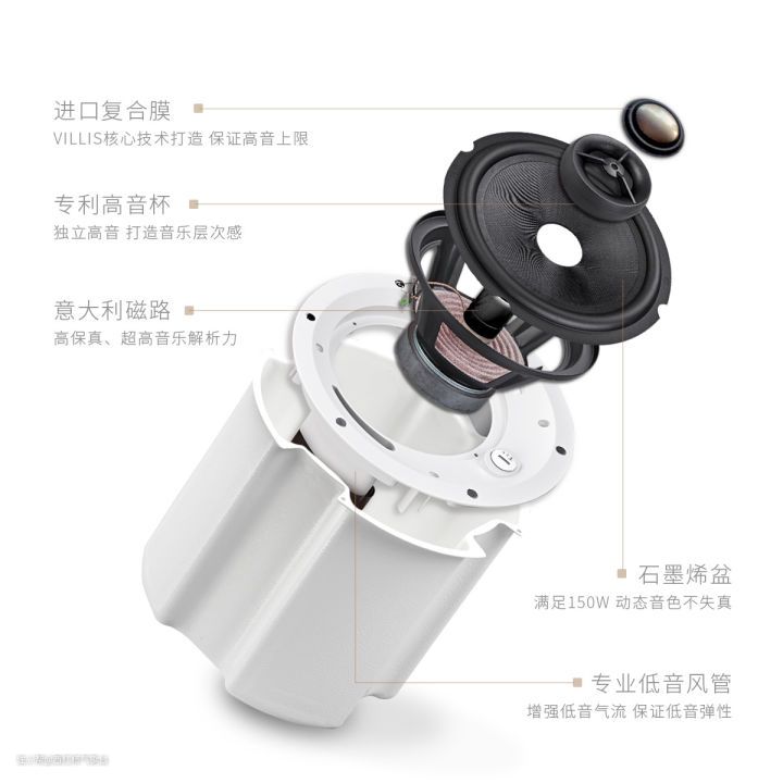 而且,这款音响安装的时候,可以隐藏吸顶安装,不占空间比较方便,以及它的环U型钢桶设计特别突出,因为音响市场大多数情况是没有钢桶设计的,都只能暗装。