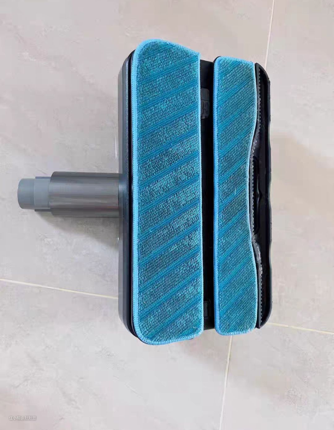 翻个个能看得更清楚,这个拖把头的两块抹布功用上各有不同,后面的这块抹布负责拖地,由于前端抹布已经阻隔了颗粒物等垃圾,所以后面的抹布只管拖地,分工明确,而两块抹布的工作频率达到了惊人的每分钟600次,这种高频率的拖地很大的提高了清扫的效率。