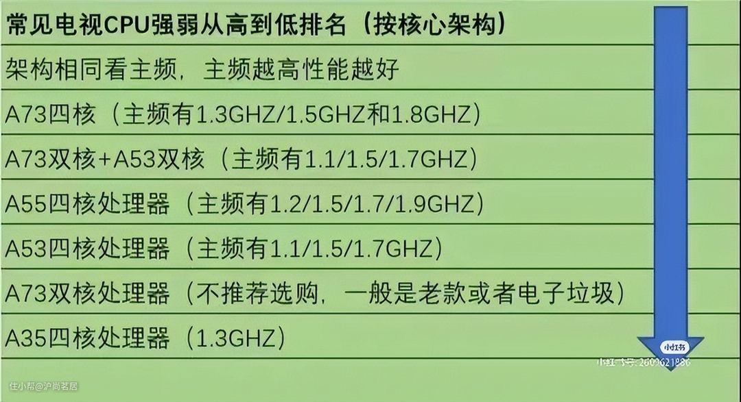 首先是处理器(CPU):处理器的好坏会直接影响到电视的运行速度和流畅度。下面这张图是目前市面上,主要的处理器性能从高到低的排序。越靠前的性能越好。