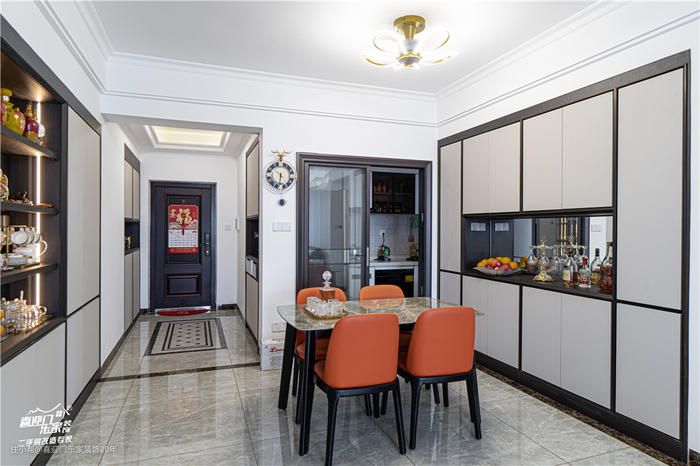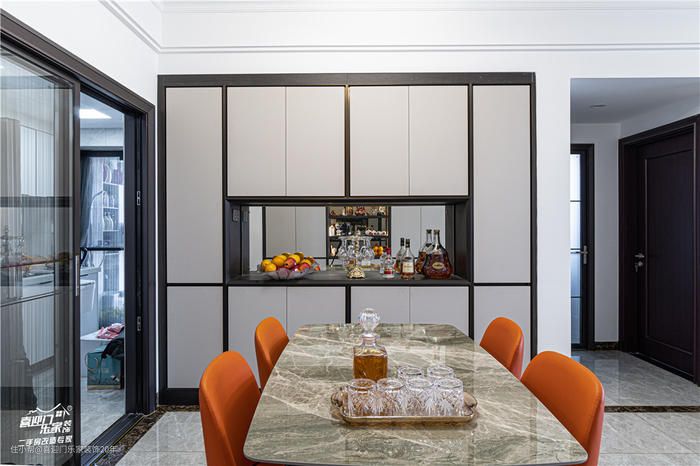 餐厅选用岩版餐桌,简约大方;暖橙色的4人位餐椅,给餐厅空间增添了温馨亮眼。