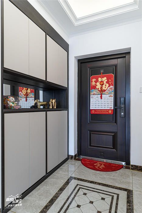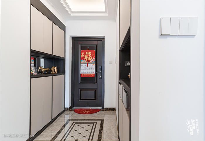 进门处,右侧则打掉与厨房之间的隔墙,安装同款嵌入式收纳柜。底部留空,可以收纳家居拖鞋,随穿随脱方便自在。收纳柜下上方收纳一些不常用的家居用品,中部预留两个抽屉也是方便拿取常用的工具。