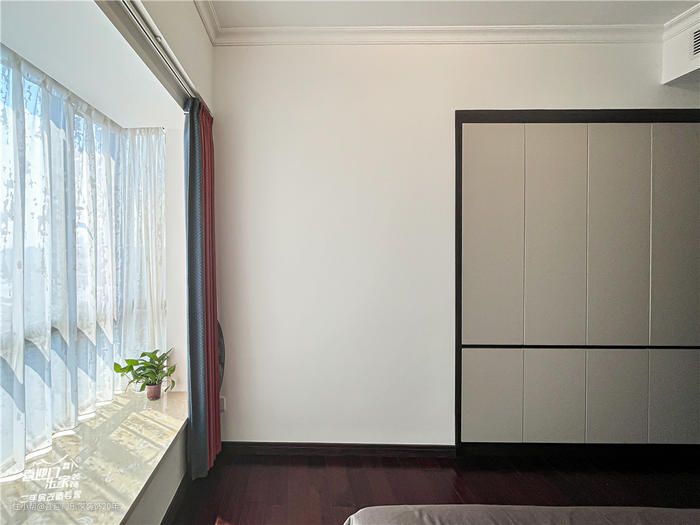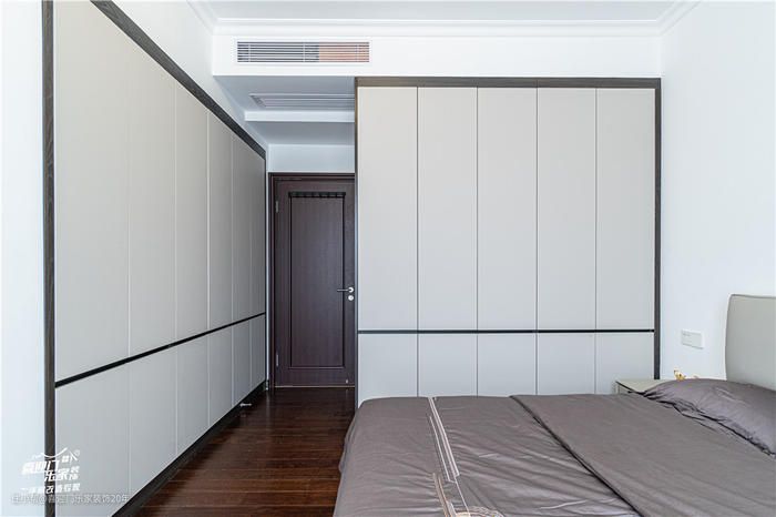 11平米的卧室里,安装了五米大衣柜。拆除卧室与客厅之间的隔墙,改做一组3米满墙衣柜,满足春夏秋冬的衣物及大件收纳。床边则安装一组2米的满墙衣柜,收纳当季的常穿的衣物等,方便整理。