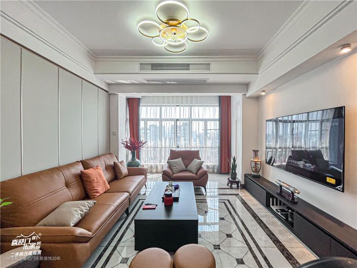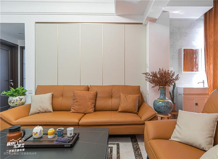 舒适的暖橙色组合皮质沙发,给予沉稳的空间温馨感又增添了一份活泼感