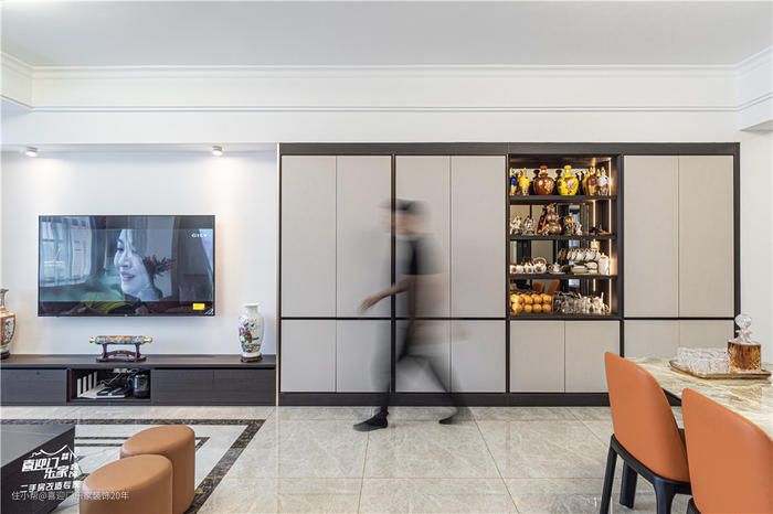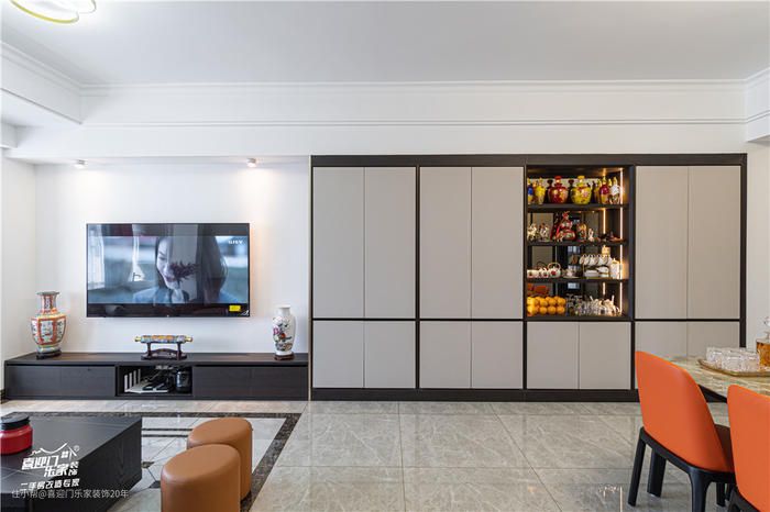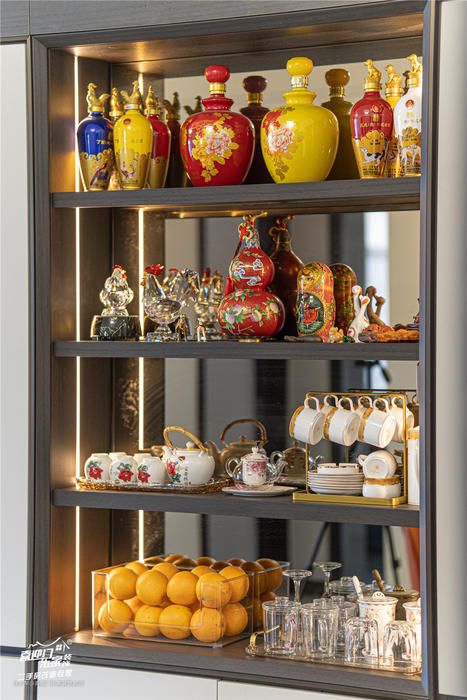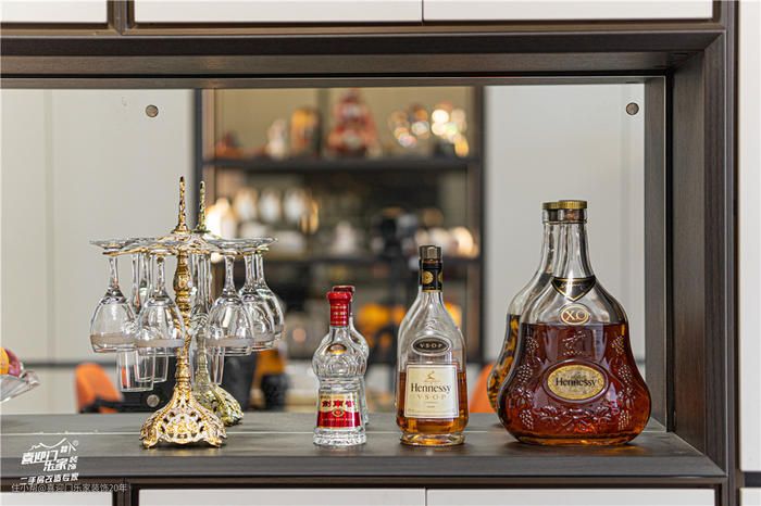 餐厅右侧做了同系列的餐边柜,同样的预留了展示柜,各类酒、酒具和茶具都安排上,既是收纳也是展示,生活的点点滴滴若隐若现。
