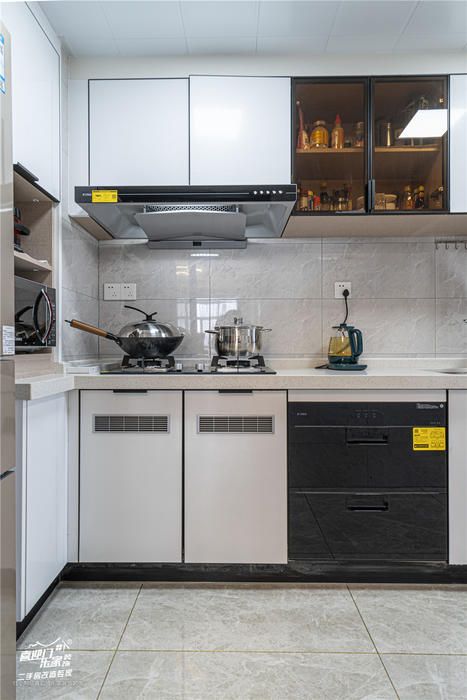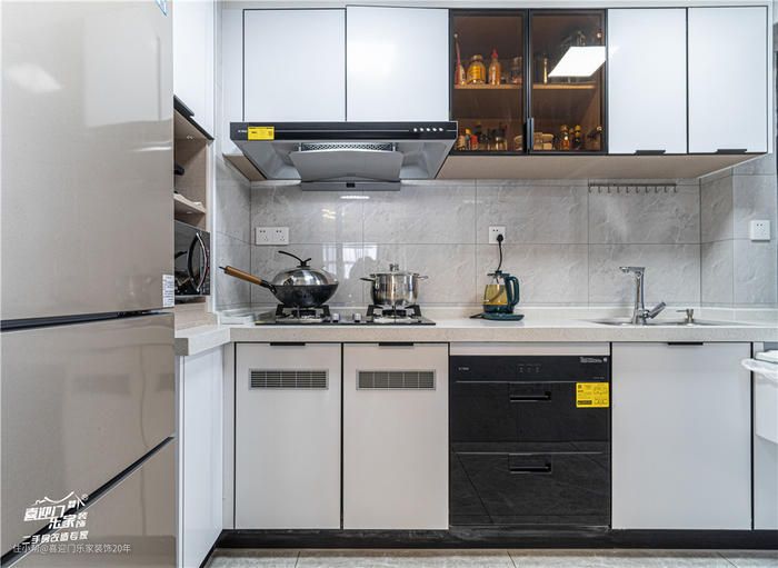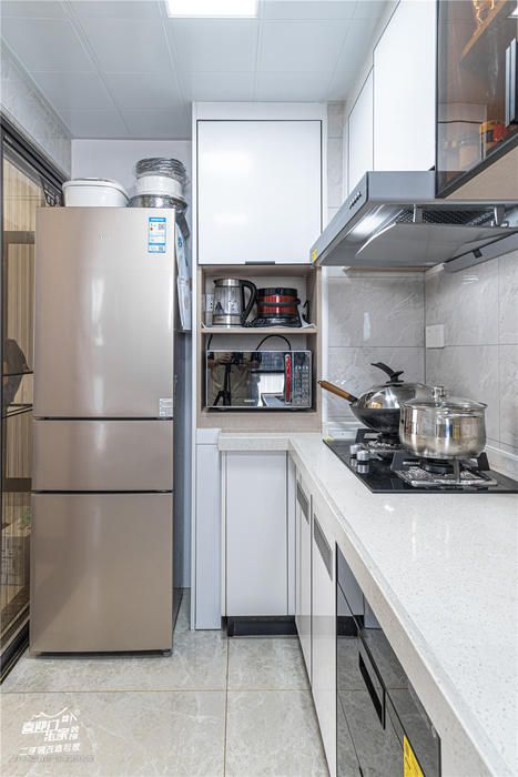 厨房侧面预留冰箱位后做一组收纳柜,可以收纳一些厨具,中部留空摆放上微波炉,平时加热饭菜方便又好用。