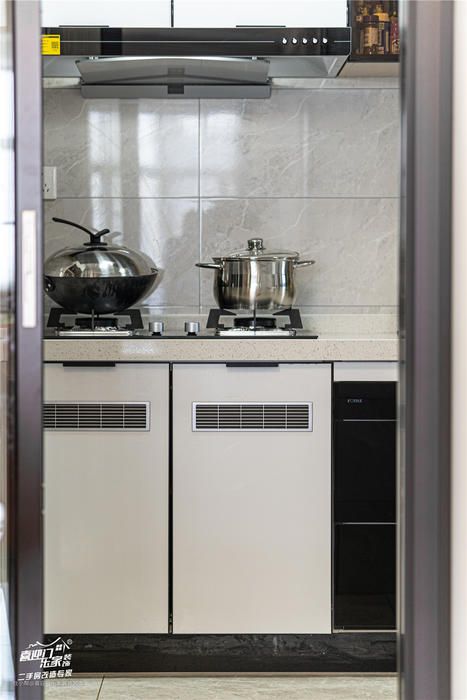 一字型橱柜足够满足洗切炒的日常需求,选用珐琅白的橱柜门搭配25mm石英石台面,简洁干净。