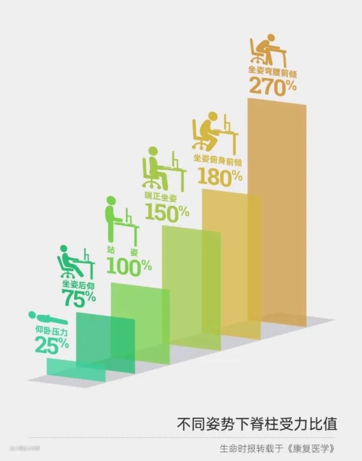 这里必须给大家科普一个关于不同姿势脊椎受力的知识。人在仰卧时脊椎受压比值25%,坐席后仰时是75%、站姿是100%、端正坐姿是150%,俯身前倾是180%,坐姿弯腰前倾是270%。
