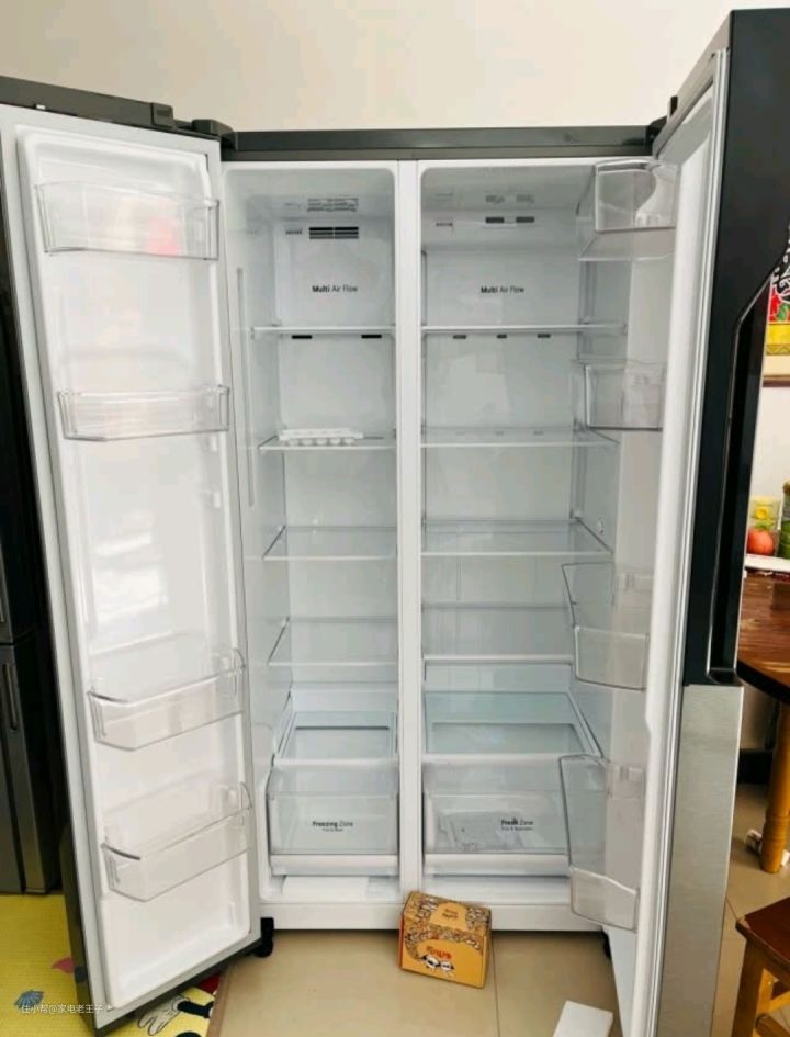 用惯了对开门冰箱之后,可能不太习惯这种术式的三门开放。其实对于一个人或者两个人来讲,如果食物的分类需求不是那么大,那么三开门的冰箱也能够满足生活需要。这种纯黑色的大冰箱还是能够给家庭提高整体装修的高级感的,并且在保鲜的时候不会把冷风直吹食物,也就不会带走食物表面的水分了。