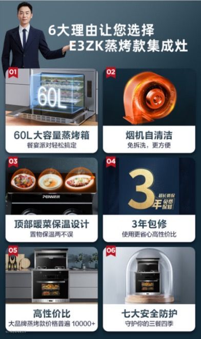 以培恩E3ZK为例,它就实现了油烟机+灶具+蒸箱+烤箱+空气炸锅+消毒柜+碗筷柜的多方面功能赋加。
