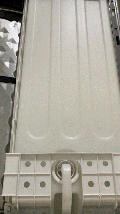 内筒内壁与外壁采用同样的材质,光滑明亮,一面是凹面一面为凸面。水容器没拆机之前,烘干衣服后从面板的左侧拉出倒里面的水,拆机机器后我特意演示了一下,如下图。