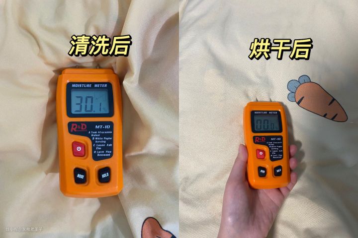 测试过滤烘干我用的是床单被罩,因为床单被罩上难免会有一些毛发、螨虫和细菌,正好可以用过滤烘干这个功能进行过滤毛发、杀菌除螨。同样的,清洗完后用仪器测试含水率为30.1%,烘干后为0。
