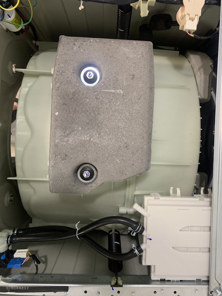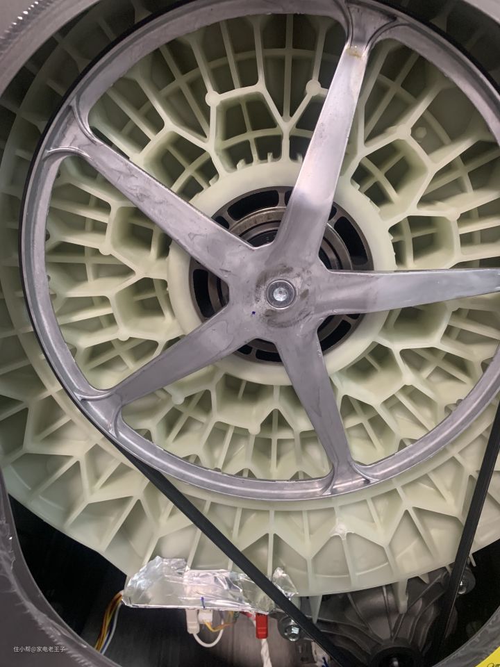相比于烘干机,洗衣机更好拆一些,拆开后盖就能看到洗衣机的盛水桶与铝盘皮带轮。其中铝盘皮带轮采用的是合金材质,要比一些使用塑料款的皮带轮安全耐用得多。