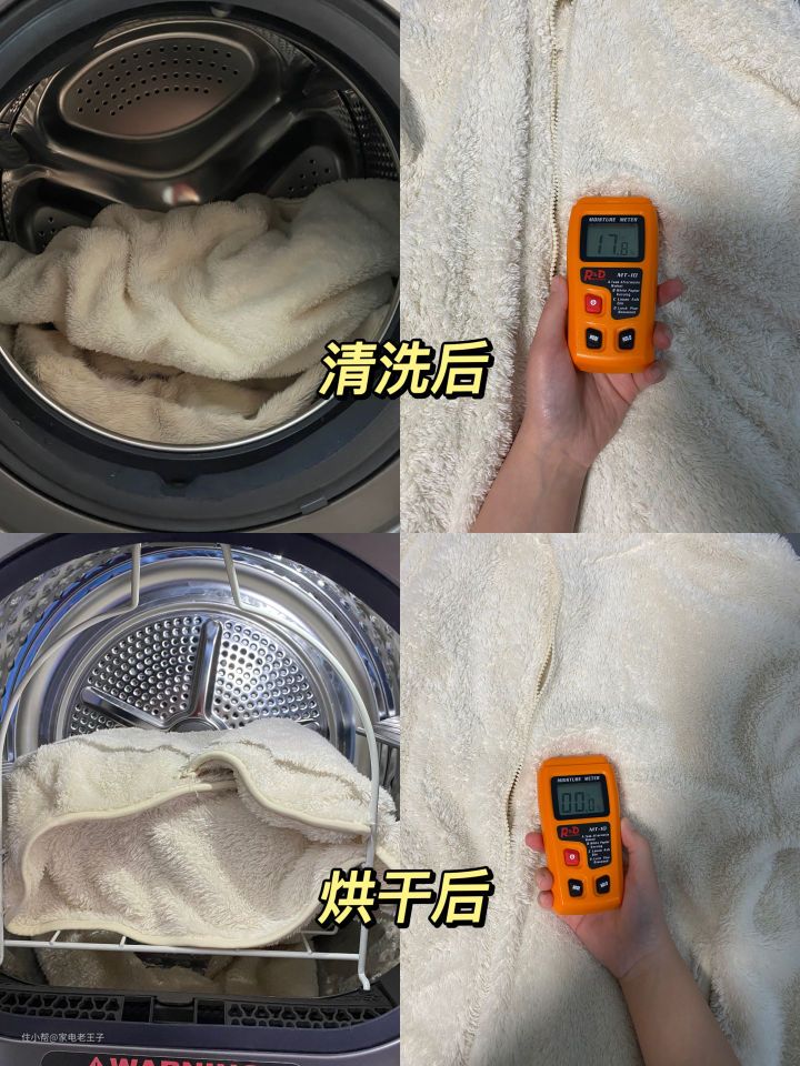 跟羊毛烘一样,我也特意用羽绒服做了一个测试,上面这张拼图可以看出,分别是羽绒服清洗完后,用仪器进行测试,含水率为17.4%,拼图的下方是烘干后,用仪器进行测试,含水率为0。