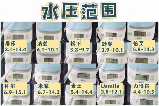跨度8g以上:Usmile、素士、拜尔(素士、拜尔的最低水压仍然偏高)