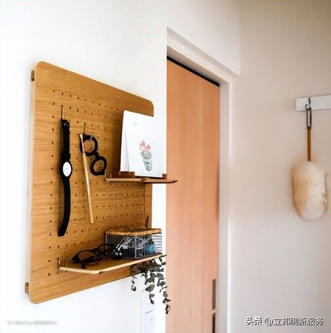 不过要记得,拆快递会用到的隐私涂抹器、刀等也都置放在玄关抽屉和台面上,方便拿取,不要焦头烂额地找东西。也可以在门口的墙面安装一块洞洞板,用来收纳这些小物件。