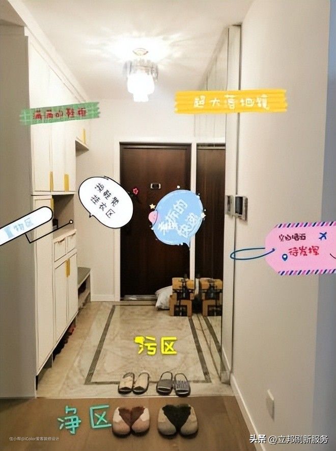 所谓的“污区”是为了专门在玄关瓷砖这块区域活动的。我们到家一般会马上换鞋,但很多玄关柜的设置是把拖鞋放置在柜体底部空挡处,这样做的小问题在于会在换鞋时把玄关的尘土和细菌也连带踩进家里。