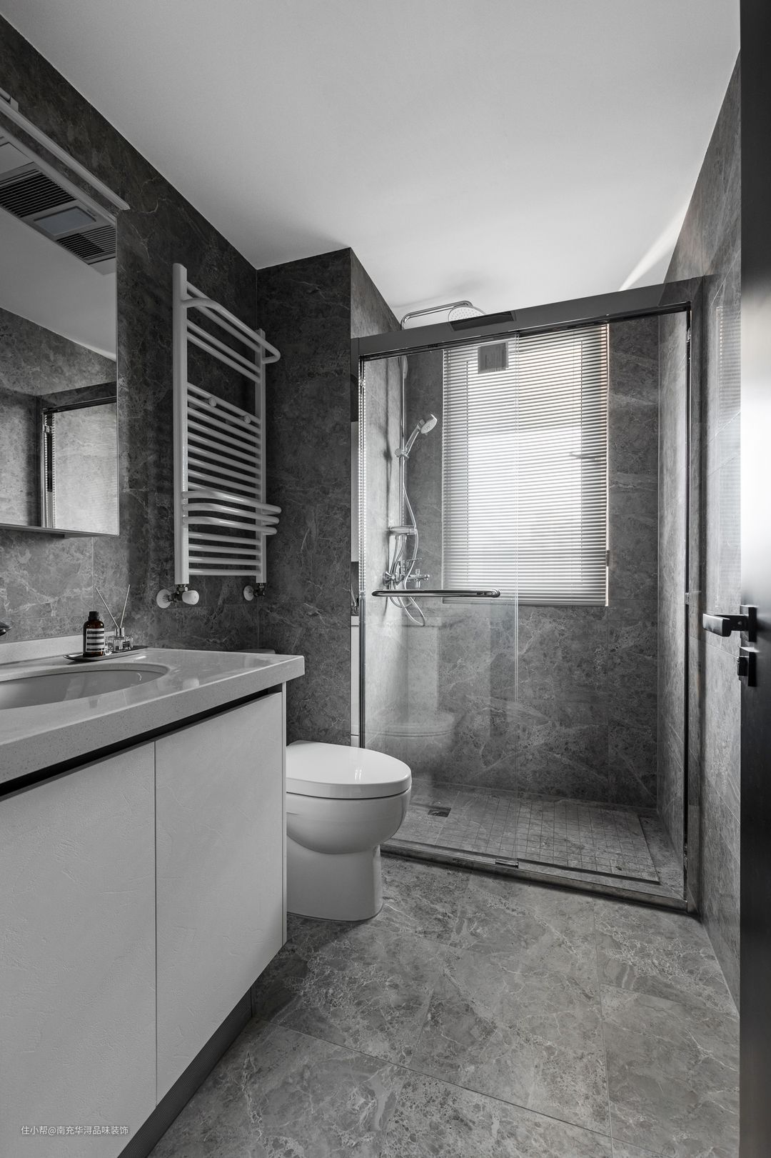不同于客厅的黑白灰, 卫生间比较客观地只选用了灰色作为卫生间的主色调,墙地面均采用灰色大理石瓷砖,有质感且耐脏。透明的推拉门将沐浴区与洗漱区分隔开,实现干湿分离。