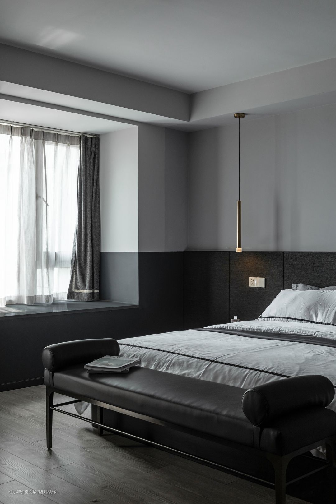 在主卧的布局上,设计师花了一些心思,上灰下白的搭配,呼应房间的主题。墙面和吊顶都十分干净利落,没有任何多余的修饰。